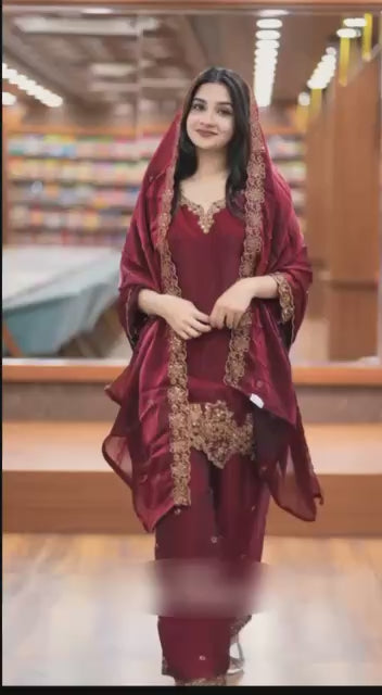 Latest designer silk hand embroidered short kurta palazzo with dupatta sets
